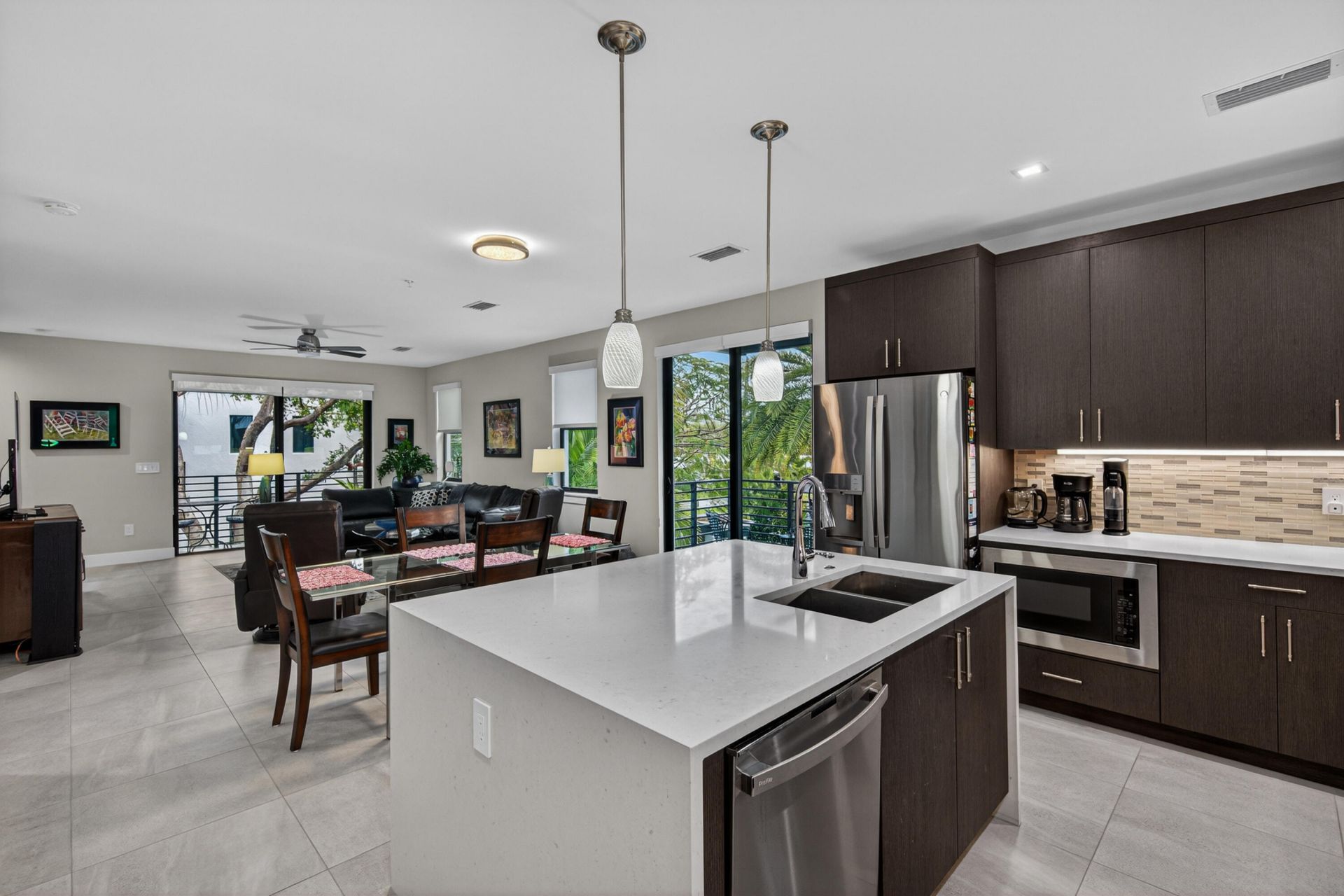 Rarely available Corner / End unit at the Village at Wilton Manors townhome boutique complex, only 14 total homes with heated community pool and just a block to Wilton Drive! First floor is an entertainment lounge or Pool Cabana as it has a half bath, wet bar and beverage cooler, with the pool just outside in the lush courtyard. 2 car garage with EV charging wired. Main living area on the second floor with another half bath, Quartz island double sink, upgraded stove and the exhaust hood is vented to the outside. Lots of light due to the corner location AND an extra covered balcony off the side dining area. 2 bedrooms and 2 full bathrooms on third level with washer/dryer in the hallway. Complex built in 2021, metal roofs. EV charger in garage. Pool Cabana-wet bat, half bath